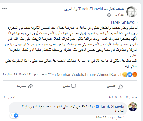 يذكر أن الدكتور محمد كمال أستاذ بجامعة كفر الشيخ، استغاث بالدكتور طارق شوقي، وزير التربية والتعليم، بسبب قيام موظفو مدرسة جمال عبدالناصر الثانوية بنات بالعجوزة بمحافظة الجيزة، باحتجاز بناته والاعتداء عليهن لفظيا وخلع حجاب إحداهن بشدة من على رأسها، بسبب إجبارهن على شراء الزي المدرسي، على حد وصفه.