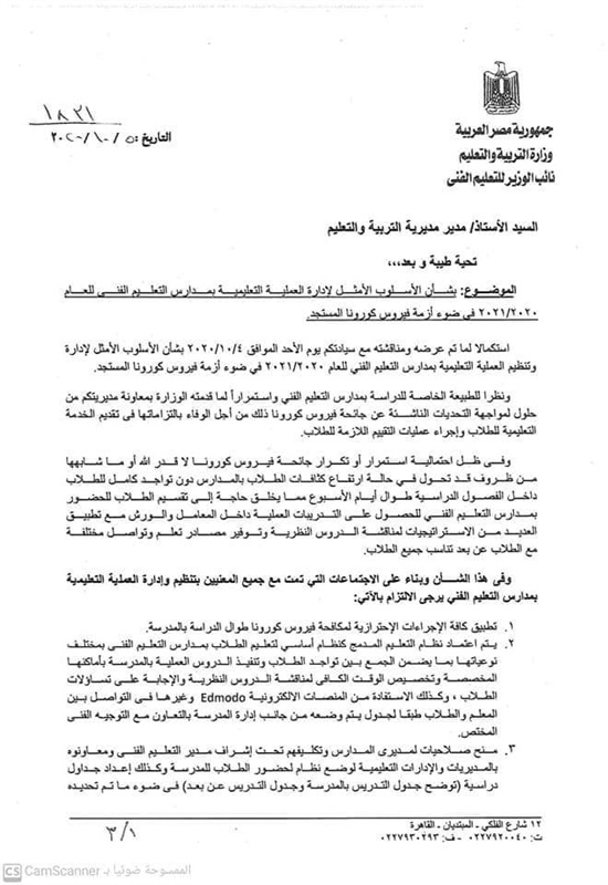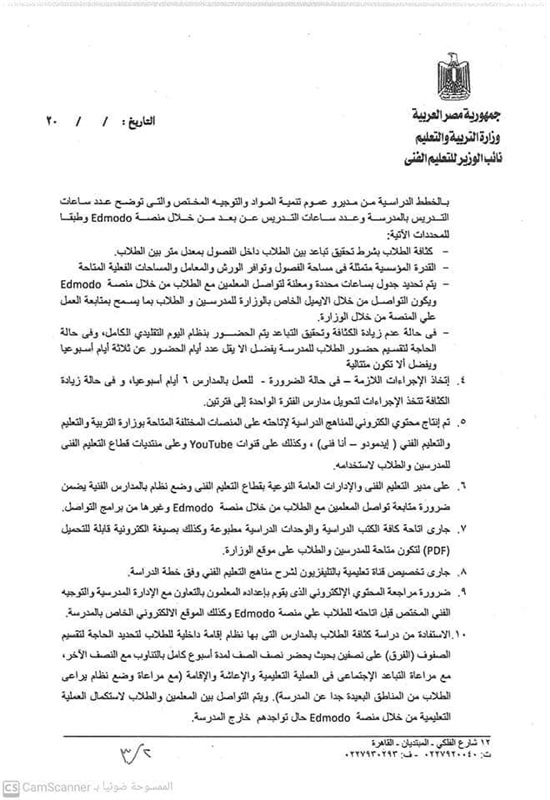 أصدرت وزارة التربية والتعليم والتعليم الفني، منشورا لمديريات التربية والتعليم لتنفيذ خطة الدراسة بمدارس التعليم الفني، للعام الدراسي 2020/2021، فى ضوء أزمة فيروس كورونا المستجد.