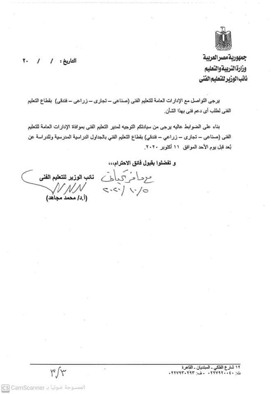 الجدول الدراسي الخاص بكل مدرسة فنية تابعة لها بحيث يكون جاهزا قبل يوم ١٧ اكتوبر