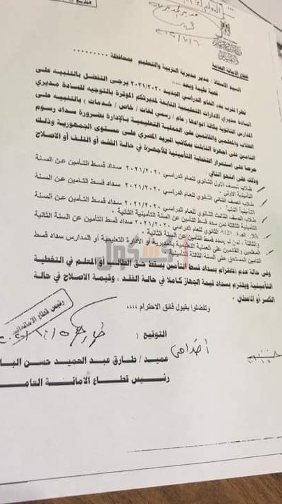 وحذرت أنه في حالة عدم الالتزام بسداد قسط التأمين يسلب حق الطالب او المعلم في التغطية التامينية، ويلتزم بسداد قيمة التابلت كاملا في حالة الفقد وقيمه الإصلاح في حالة الكسر.