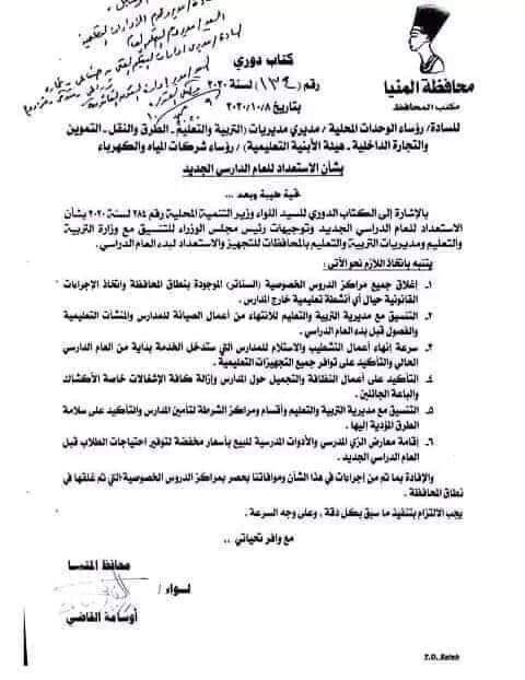 ١- إغلاق جميع مراكز الدروس الخصوصية (السناتر) الموجودة بنطاق المحافظة واتخاذ الإجراءات القانونية حيال أي أنشطة تعليمية خارج المدارس.