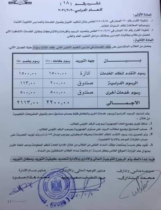 أعلنت وزارة التربية والتعليم والتعليم الفني، تحديد الرسوم والغرامات والاشتراكات ومقابل الخدمات الاضافية التي تحصل من طلبة وطلبات بالمدارس الثانوية الفنية بنوعياتها المختلفة نظام السنوات الثلاث.