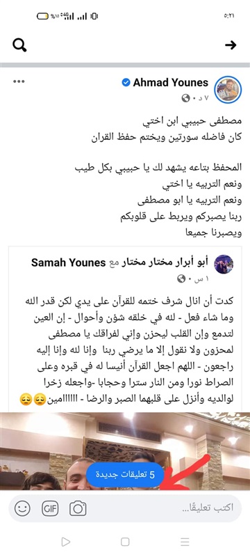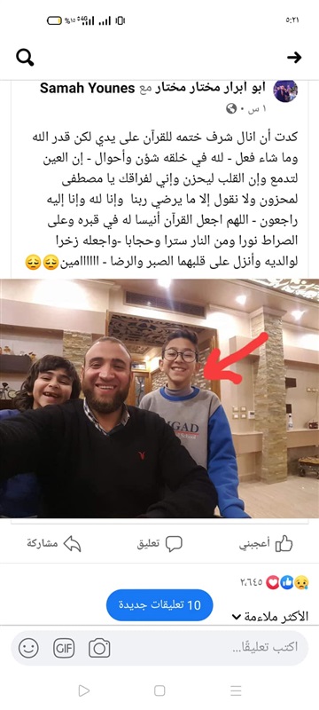 فكتب بمنشور عبر صفحته الشخصية على أحد مواقع التواصل الاجتماعي " الفيس بوك" قائلا: " كدت أن انال شرف ختمه للقرآن على يدي لكن قدر الله وما شاء فعل - لله في خلقه شؤن وأحوال - إن العين لتدمع وإن القلب ليحزن وإني لفراقك يا مصطفى لمحزون ولا نقول إلا ما يرضي ربنا وإنا لله وإنا إليه راجعون - اللهم اجعل القرآن أنيسا له في قبره وعلى الصراط نورا ومن النار سترا وحجابا -واجعله زخرا لوالديه وأنزل على قلبهما الصبر والرضا - أمين ".