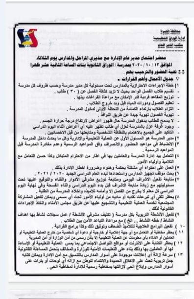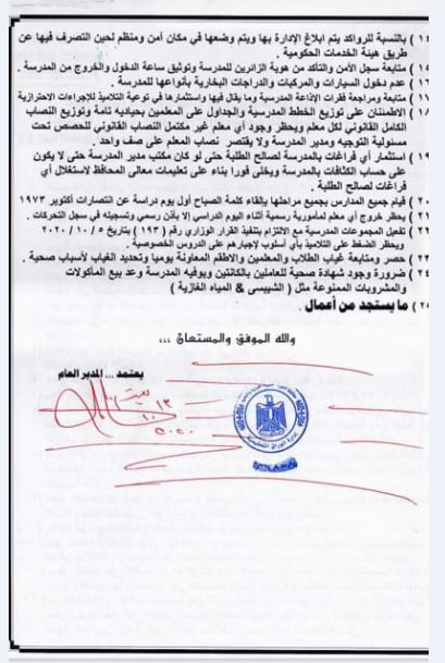 1) خطة الاجراءات الاحترازية بالمدارس تحت مسئولية كل مدير مدرسة وحسب