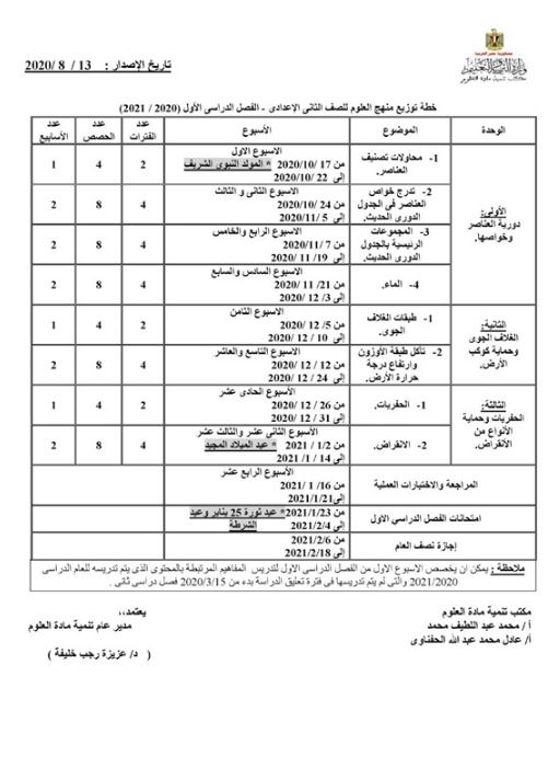الثاني الإعدادي، توزيعة منهج مادة العلوم الترم الأول 2020، حيث أصدر مكتب