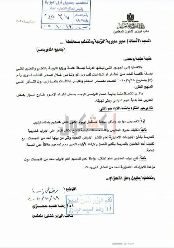 التربية والتعليم خلال خطاب رسمي وقع عليه الدكتور رضا حجازي نائب وزير التربية
