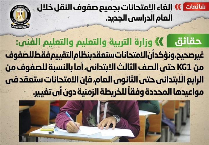 واكدت وزارة التربية والتعليم والتعليم الفني، أن هذا غير صحيح، وتؤكد أن الامتحانات ستعقد بنظام التقييم فقط للصفوف من كي جي1 حتي الصف الثالث الابتدائي.