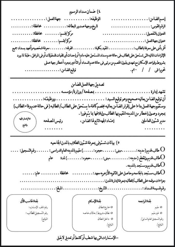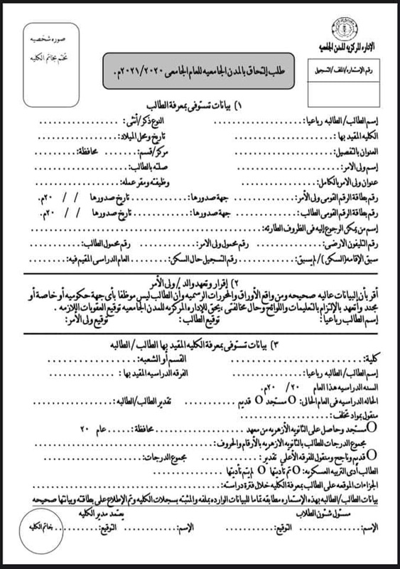 دعت جامعة الأزهر، طلاب وطالبات الفرق النهائية بالكليات، بطبع الاستمارة المرفقة واستيفاؤها قبل التسكين، وإحضار الأوراق المطلوب كافة؛ لسرعة إتمام التسكين.