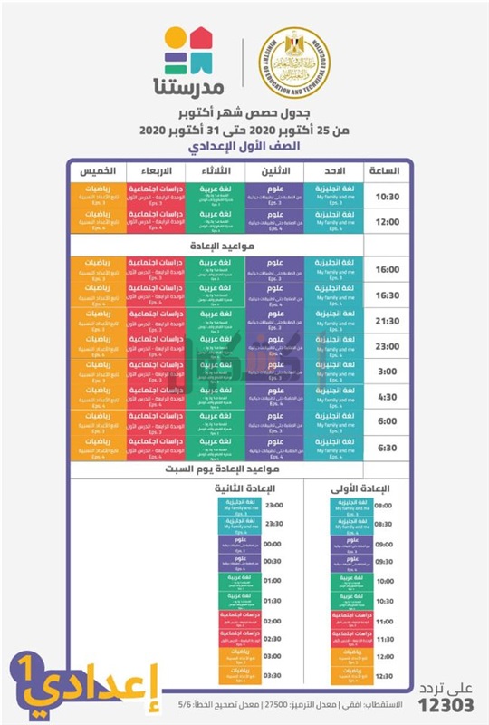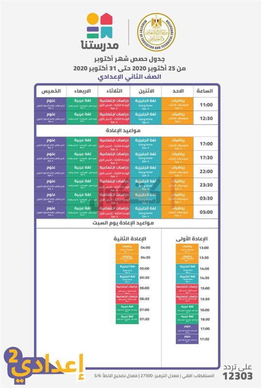 كانت قد أعلنت وزارة التربية والتعليم والتعليم الفني، جداول عرض الحصص التعليمية للمواد الأساسية (المواد داخل المجموع) من الصف الرابع الابتدائي حتى الثالث الإعدادي على القناة التعليمية «مدرستنا»، وذلك في الفترة من يوم الأحد ٢٥ أكتوبر حتى السبت ٣١ أكتوبر ٢٠٢٠، على أن يتم اعادة هذه الحصص يومي الجمعة 30 اكتوبر، والسبت 31 أكتوبر.