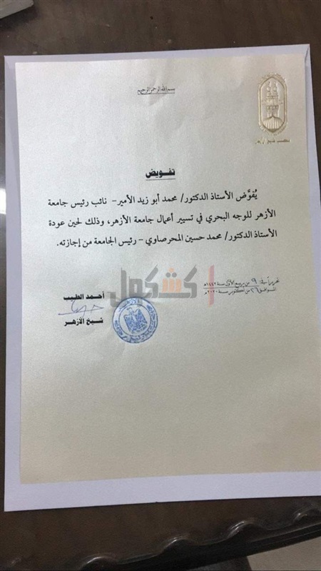 كلف الدكتور أحمد الطيب شيخ الأزهر، الدكتور محمد أبو زيد الأمير، نائب شئون الوجه البحري، بتسيير أعمال رئيس الجامعة، بعد تعرض الدكتور محمد المحرصاوي لارتفاع في ضغط الدم.
