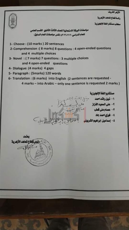حصل كشكول على مواصفات امتحان اللغة الإنجليزية للصف الثالث الثانوي الأزهري بقسميه " علمي- أدبي".