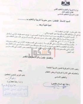 حصل «كشكول» علي منشور رسمي من إدارة التعليم الأساسي للمديريات التعليمية، نص على أن تقوم المديريات التعليمية بتكليف من تراه مناسبا لهذا المسمي ( موجه صفوف أولي) وفق الشروط الواردة بالفاكس الصادر من نائب وزير التعليم لشؤون المعلمين ، بتاريخ ١٧ يناير في هذا الشأن .