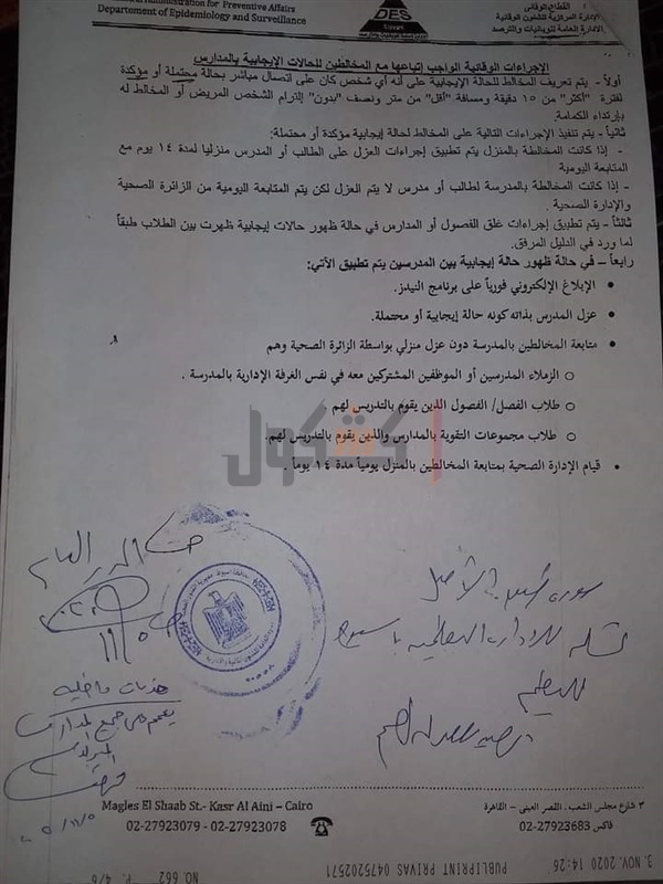 عممت وزارة التربية والتعليم والتعليم الفني، منشورا على المديريات التعليمية، بشأن الإجراءات الوقائية الواجب اتباعها للحالات الإيجابية بفيروس كورونا في المدارس.