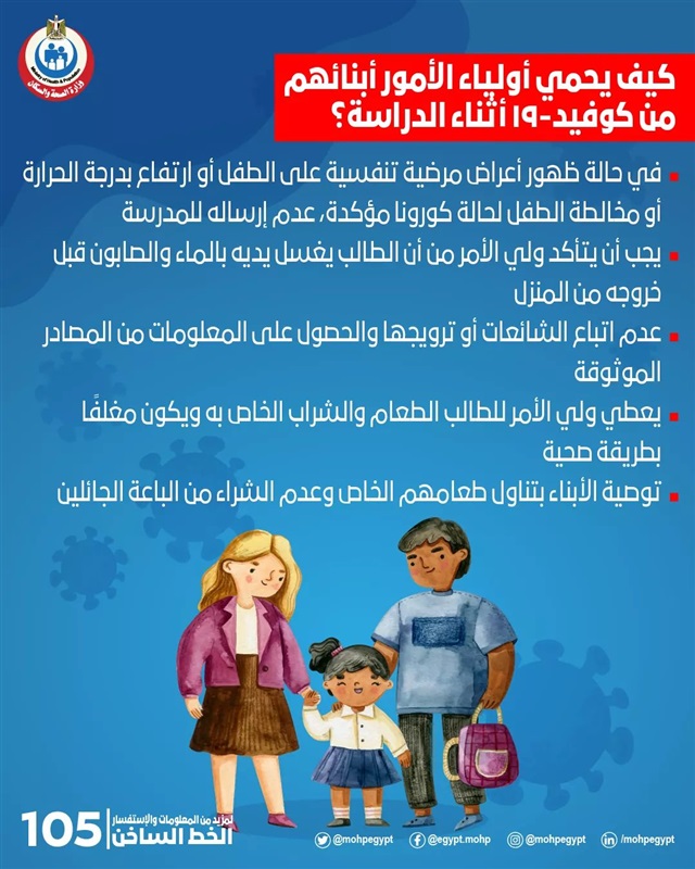 كشفت وزارة الصحة والسكان، عن كيفية حماية أولياء الأمور أبنائهم من المرض الوبائي" كورونا" خلال فترة الدراسة، وجاءت النصائح كالتالي: