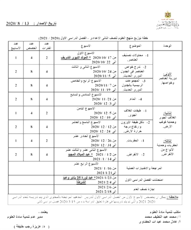 ننشر منهج العلوم للصف الثاني الإعدادي الترم الأول 2020 حيث أصدر مكتب تنمية مادة العلوم بوزارة التربية والتعليم والتعليم الفني، خطة توزيع منهج مادة العلوم للصف الثاني الاعدادي 2020 الفصل الدراسي الأول بالعام الدراسي 2020/2021.