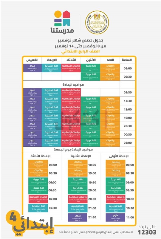وتضمن جدول الحصص من الصف الرابع الابتدائي حتى الثالث الإعدادي على القناة التعليمية "مدرستنا”، في الفترة من يوم الأحد ٨ نوفمبر حتى السبت ١٤ نوفمبر ٢٠٢٠.