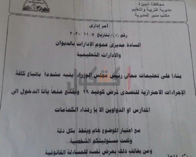 حظر دخول الإدارات التعليمية والمدارس بالجيزة دون ارتداء كمامة.. مستند