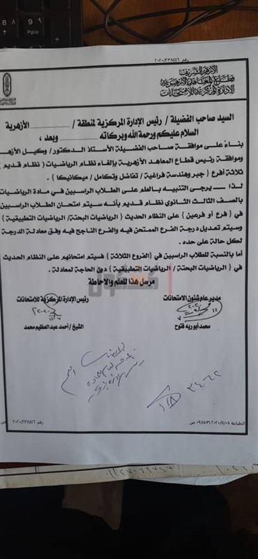 قرر الأزهر الشريف، بإلغاء النظام القديم لمادة الرياضيات لطلاب الشهادة الثانوية الأزهرية " ثلاثة أفرع " جبر وهندسة فراغيةـ تفاضل وتكامل ـ ميكانيكا"، بعد موافقة وكيل الأزهر ورئيس قطاع المعاهد.