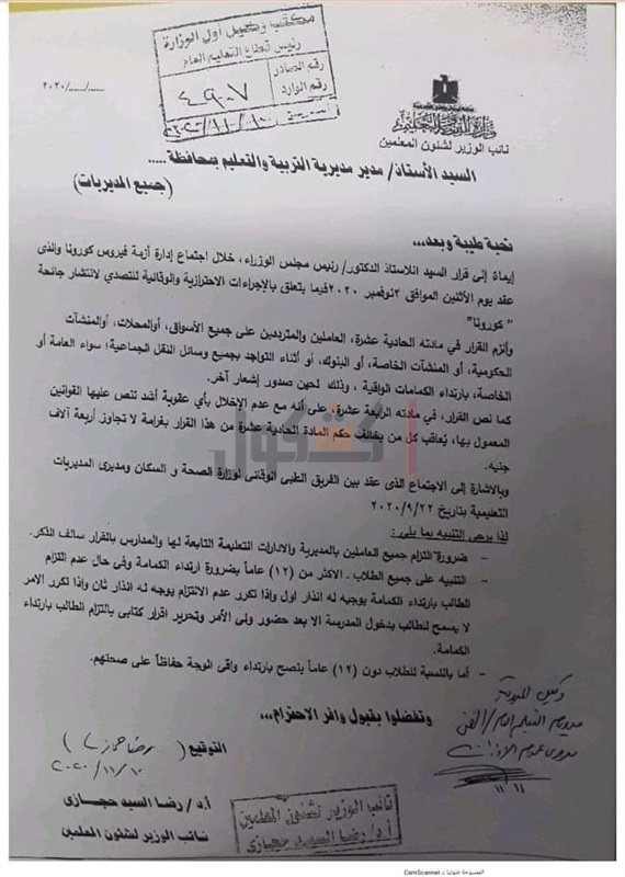 ننشر خطاب "التعليم" للمديريات بشأن الالتزام بارتداء الكمامات