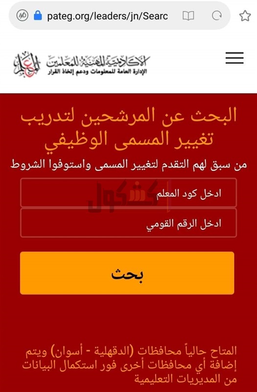 وادخال كود المعلم والرقم القومي؛ مشيرك إلي أن المطلوب في الوقت الحالي محافظات (الدقهلية_أسوان) ويتم إضافة أي محافظات آخرى فور استكمال البيانات من المديريات التعليمية.