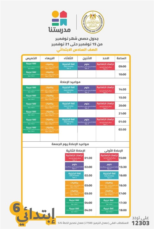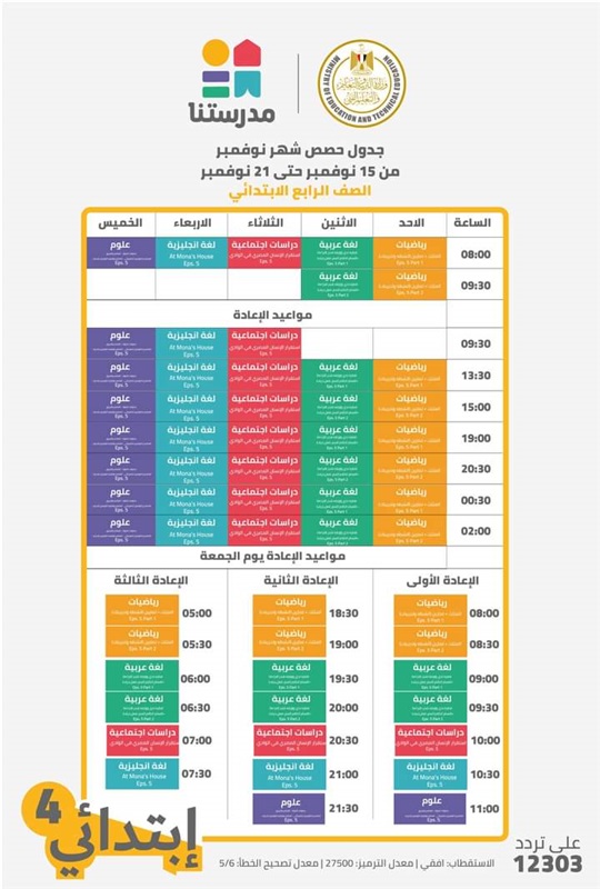 أعلنت وزارة التربية والتعليم والتعليم الفني؛ جداول الأسبوع الخامس لعرض الحصص التعليمية للمواد الأساسية (المواد داخل المجموع) بداية من الصف الرابع الابتدائي حتى الثالث الإعدادي على القناة التعليمية "مدرستنا".
