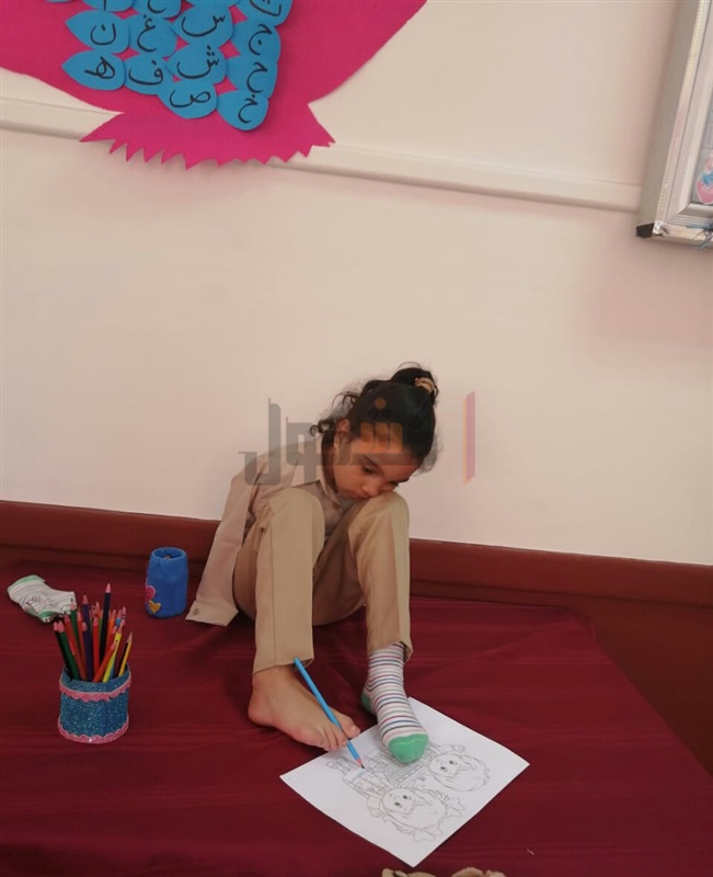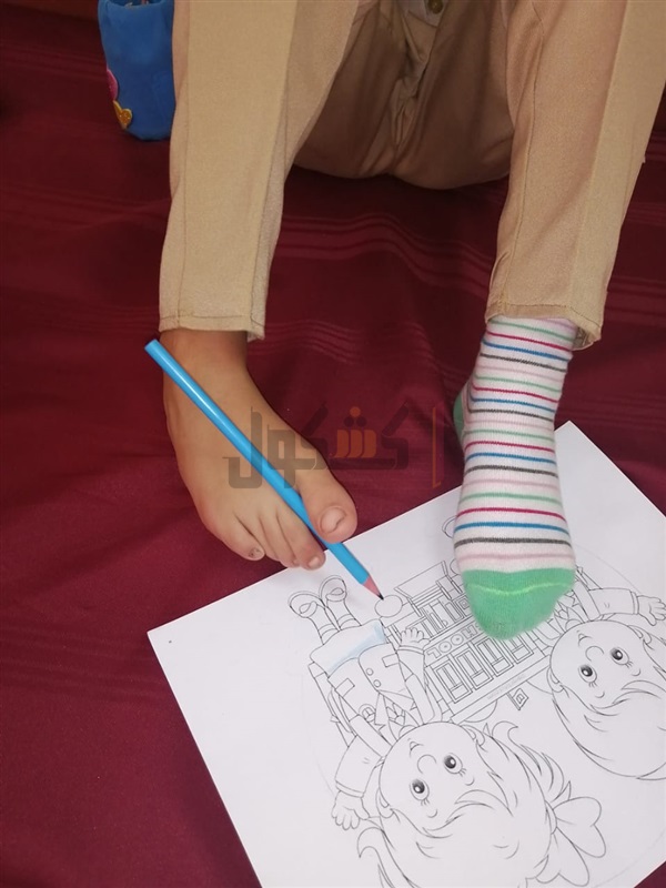 حيث أن التلميذة رحمة من تلاميذ الدمج التعليمي "ذوي الإحتياجات والقدرات الخاصة" بالمدرسة، وتقوم بالرسم والتلوين باستخدام القدم.