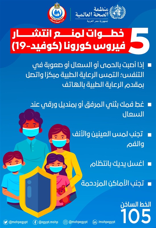 وجهت وزارة الصحة والسكان، 5 نصائح للمواطنين لمنع انتشار "كوفيد-19" المسمي إعلاميًا بـ"فيروس كورونا المستجد".