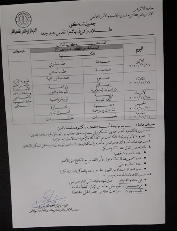 أعلنت جامعة الأزهر، تسكين طلاب وطالبات الفرق النهائية الحاصلين على تقدير جيد جدًّا بكليات الجامعة بالقاهرة، بدءا من غد الاثنين.
