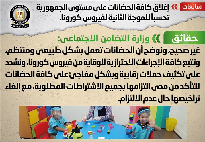 وقال المركز في بيان اليوم، إنه تواصل مع وزارة التضامن الاجتماعي، والتي نفت تلك الأنباء، مُؤكدةً أنه لا صحة لإغلاق كافة الحضانات على مستوى الجمهورية، مُوضحةً أن الحضانات تعمل بشكل طبيعي ومنتظم، وتتبع كافة الإجراءات الاحترازية للوقاية من فيروس كورونا، مُشددةً على تكثيف حملات رقابية وبشكل مفاجئ على كافة الحضانات للتأكد من مدى التزامها بجميع الاشتراطات المطلوبة، مع إلغاء تراخيصها حال عدم الالتزام.