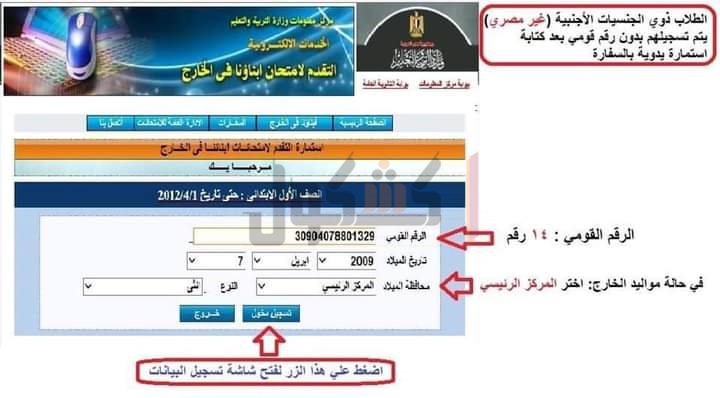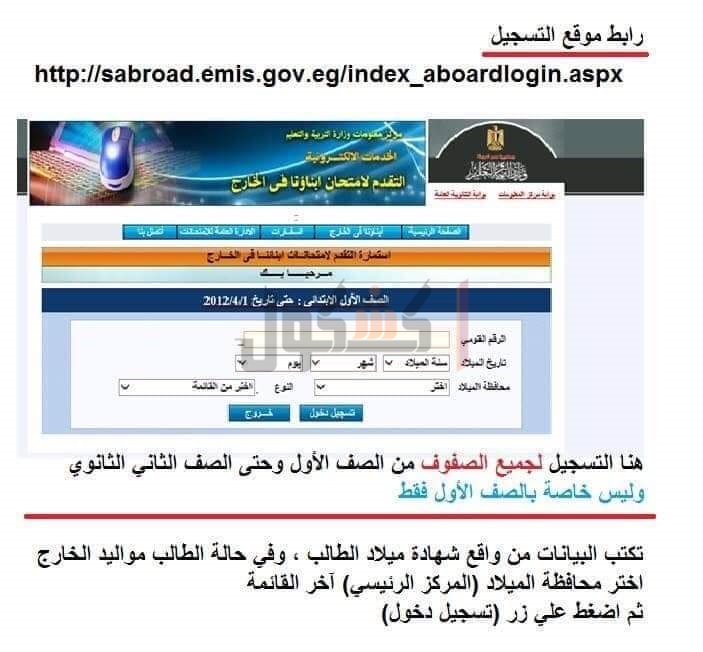 و يبدأ التسجيل بنظام أبناؤنا في الخارج اعتبارًا من يوم الاثنين 16/11/2020 من الصف الأول الابتدائي وحتى الصف الثاني الثانوي من خلال موقع وزارة التربية والتعليم والتعليم الفني ـ مركز المعلومات ـ أبناؤنا في الخارج https://sabroad.emis.gov.eg/