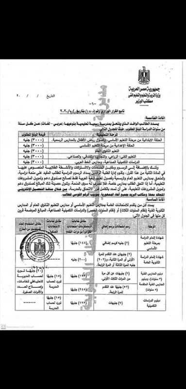 وأكدت الوزارة في قرارها على أن يسدد كل من يتقدم للامتحانات العامة بمدارس التعليم الأساسي أو مدارس التعليم الثانوي العام أو مدارس الثانوية الفنية "نظام الثلاث سنوات" أو "نظام الخمس سنوات"، والدراسات التكميلية الصناعية المبالغ الموضحة.