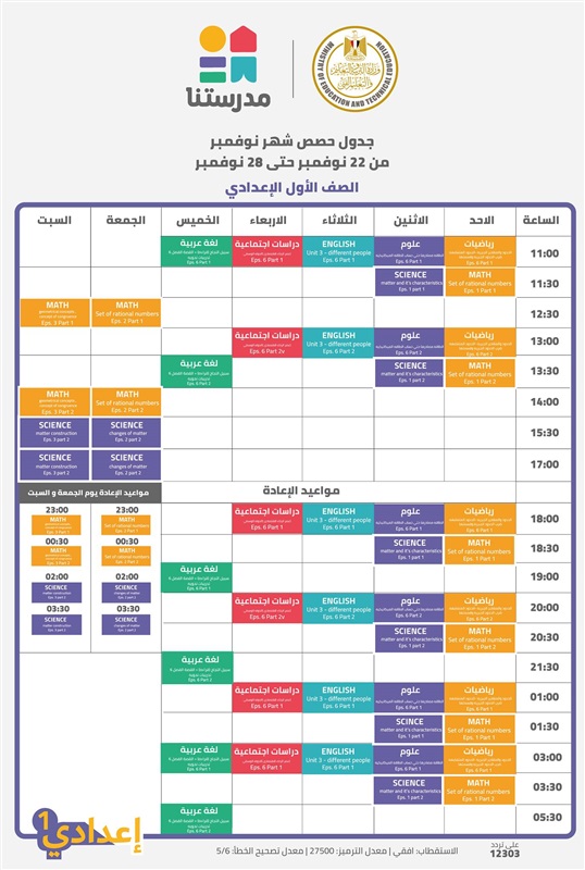 أعلنت إدارة قطاع المعاهد الأزهرية، عن جداول الأسبوع الخامس لعرض الحصص التعليمية للمواد الأساسية - المواد داخل المجموع- من الصف الرابع الابتدائى حتى السادس الابتدائى على القناة التعليمية "مدرستنا" في الفترة من يوم الأحد 22 نوفمبر حتى السبت 28 نوفمبر ٢٠٢٠.