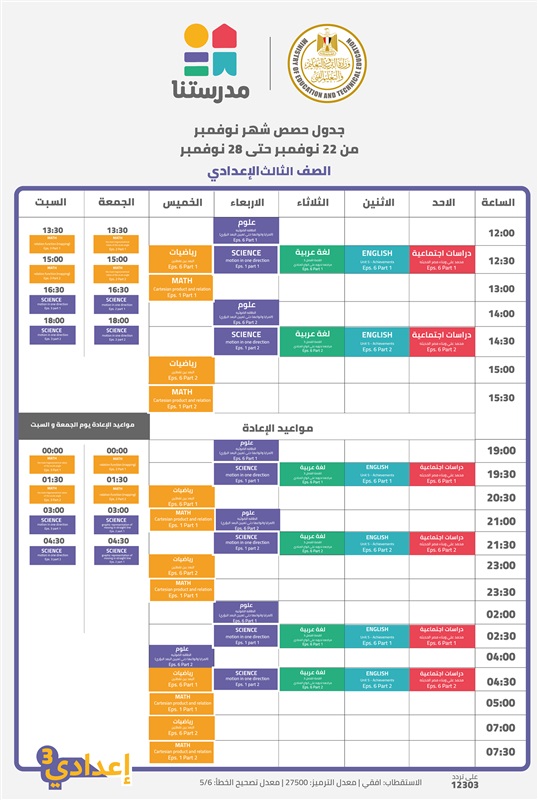 من المقرر أن تكون العروض التليفزيونية المتواجدة فى جداول الطلاب خلال الأسبوع الرابع خاص بالمواد الثقافية فقط وهى الرياضيات واللغة الانجليزية والدراسات الاجتماعية والعلوم والكمبيوتر، وهم المواد الأساسية للطلاب فى الفترة الحالية.