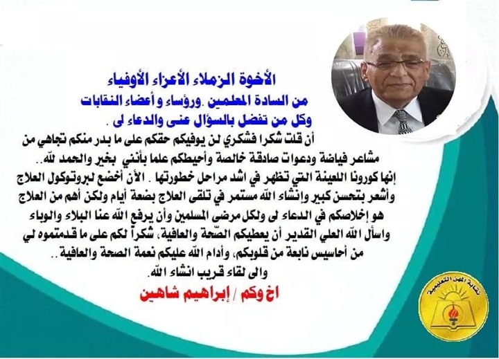 وقال وكيل نقابة المعلمين ، أنه يتلقي العلاج منذ بضعة أيام ، وفق البروتوكول العلاجي ، وأنه يشعر بتحسن كبير ، داعيا الجميع بالإخلاص له في الدعاء ولكل المرضي، و أن يرفع البلاء و الوباء.