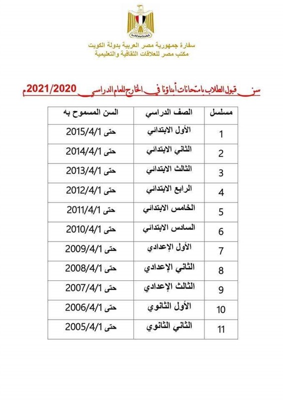 حددت السفارة المصرية بدولة الكويت سن قبول الطلاب لاداء امتحانات أبناؤنا في الخارج وذلك للفصل الدراسي 2020/2021 يرصدها "كشكول " في النقاط التالية: