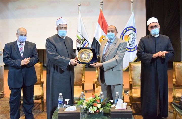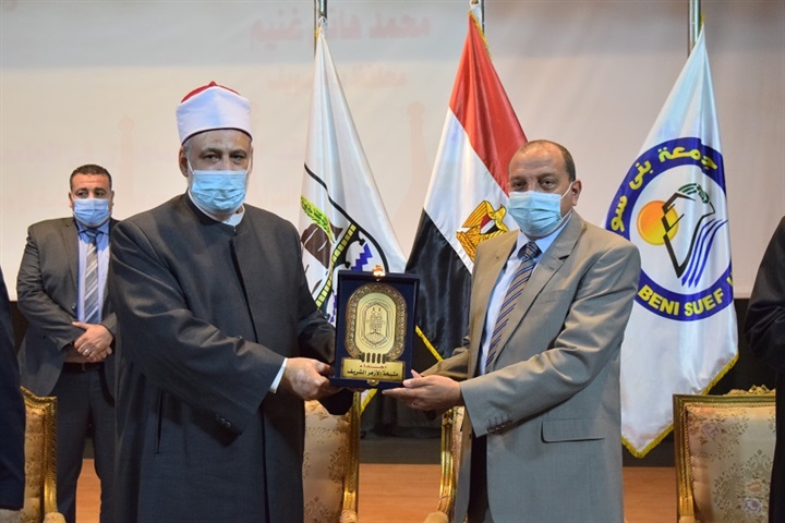 عليها، وفي نهاية اللقاء أهدى رئيس جامعة بني سويف درع الجامعة إلى وكيل الأزهر الشريف.