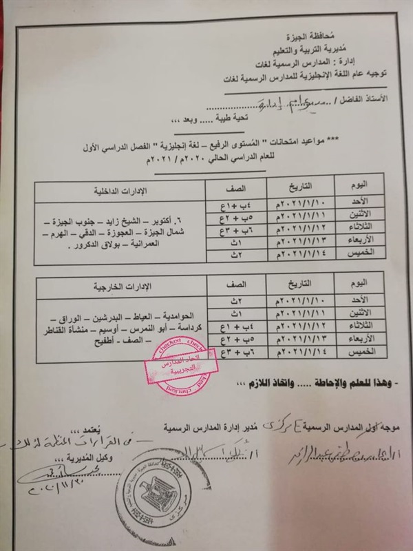 أعلن توجيه عام اللغة الإنجليزية للمدارس الرسمية لغات بمديرية التربية والتعليم بالجيزة، عن مواعيد امتحانات "المستوي الرفيع - لغة إنجليزية" الفصل الدراسي الأول للعام الدراسي الحالي 2020/2021 م.