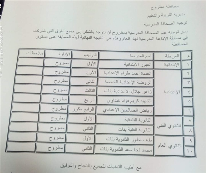 - مطروح الفندقية تحدث المفاجأة وتحصد المركز الاول علي مستوي المحافظة بالمسابقة الإذاعية علي مستوي مدارس التعليم الفني واكتفت المدرسة الثانوية الفنية بنات بالمركز الثاني.
