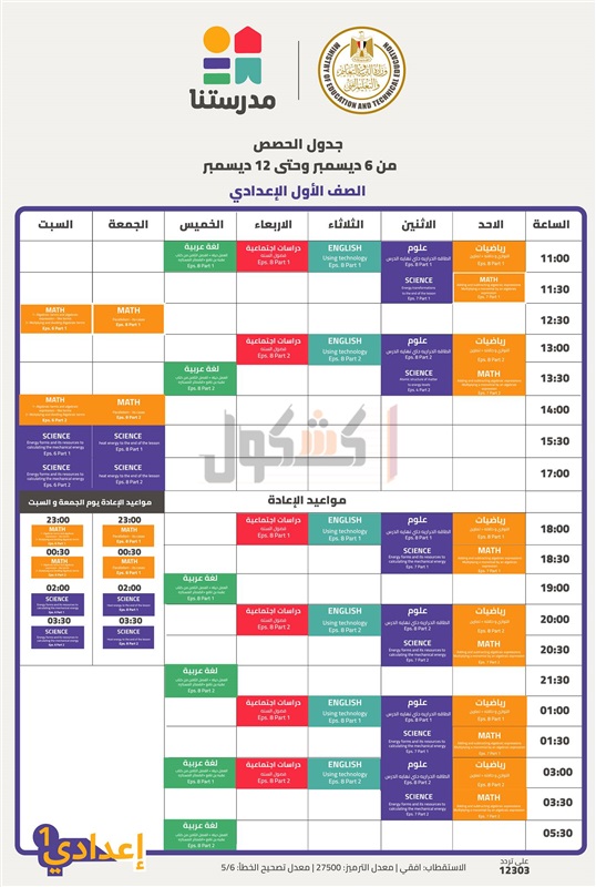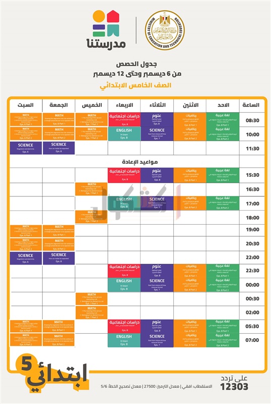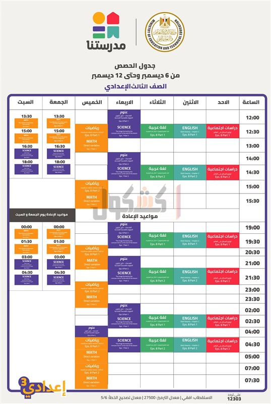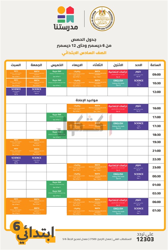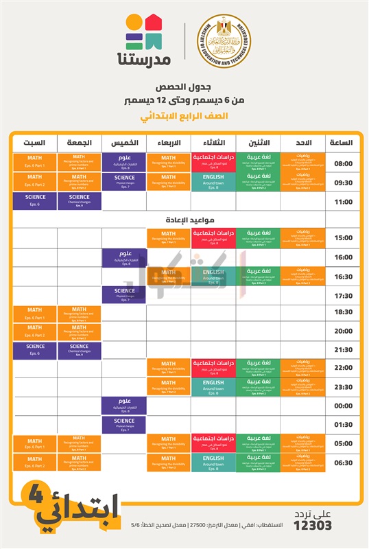أعلنت وزارة التربية والتعليم والتعليم الفني، جداول الأسبوع الثامن لعرض الحصص التعليمية للمواد الأساسية (المواد داخل المجموع) من الصف الرابع الابتدائي حتى الثالث الإعدادي على القناة التعليمية "مدرستنا".