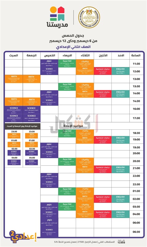 أعلنت إدارة قطاع المعاهد الأزهرية، عن جداول الأسبوع السادس لعرض الحصص التعليمية للمواد الأساسية - المواد داخل المجموع- من الصف الأول الاعدادى حتى الثالث الاعدادى على القناة التعليمية "مدرستنا" في الفترة من يوم الأحد 6 ديسمبر حتى السبت 12 ديسمبر ٢٠٢٠.
