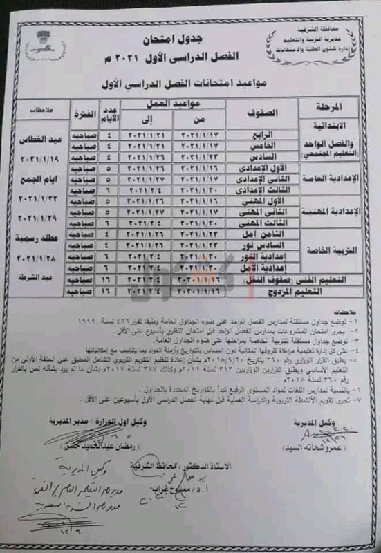 مواعيد امتحانات الفصل الدراسي الأول بالشرقية