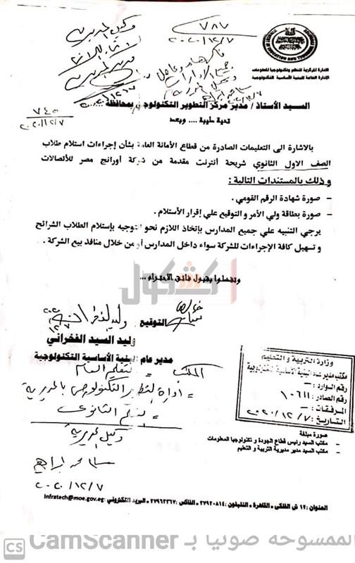 خطاب لمدير مركز التطوير التكنولوجي بالمديريات التعليمية، بشأن اجراءات استلام طلاب