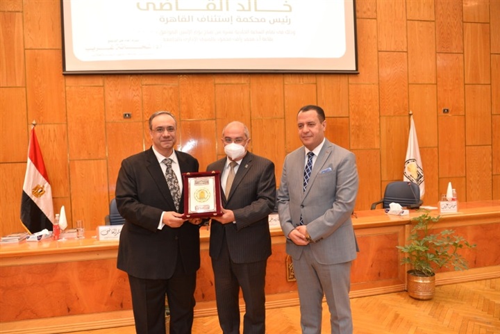 الدكتور طارق الجمال درع الجامعة للمستشار خالد القاضي تكريمًا له على مشاركته في فعاليات