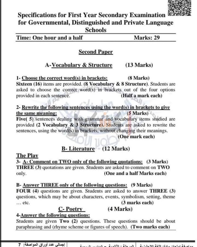 مواصفات امتحان اللغة الإنجليزية لطلاب أولى وثانية ثانوي 2021
