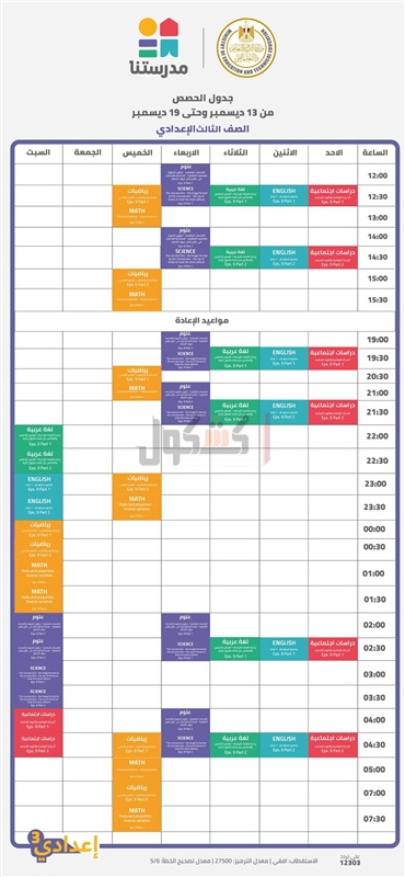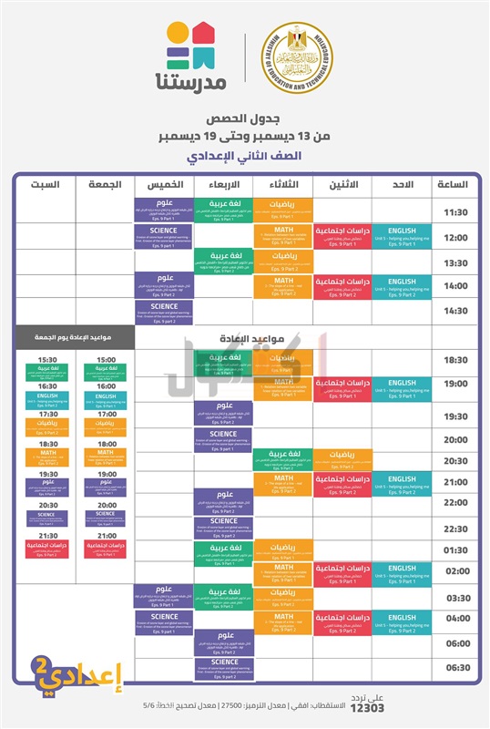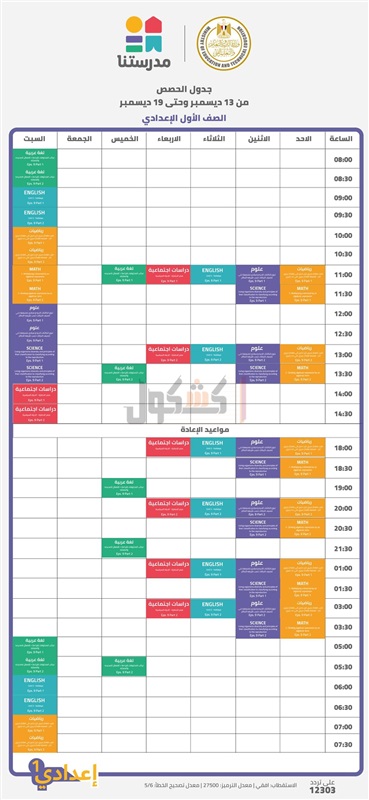 جدول مواعيد عرض الدروس الأسبوعي لطلاب الإعدادية الأزهرية من 13 حتى 19 ديسمبر