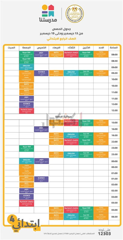 من الصف الرابع الابتدائى حتى السادس الإعدادى على القناة التعليمية "مدرستنا"