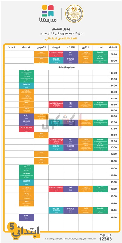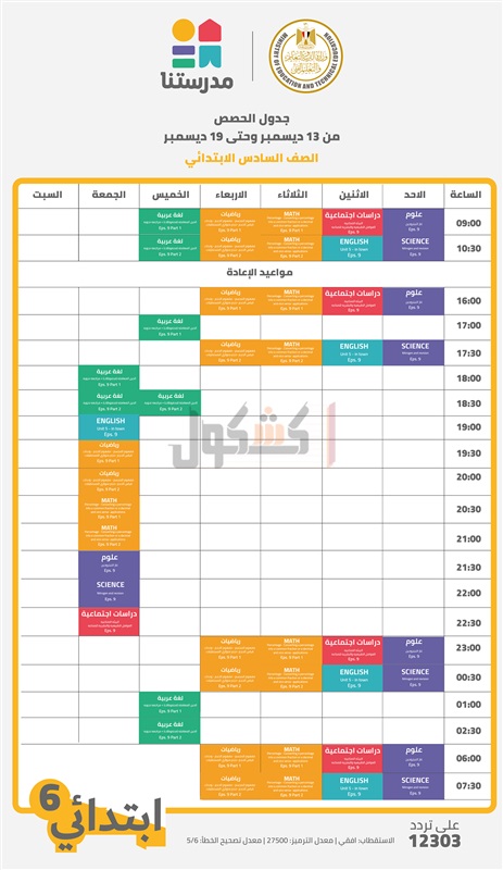 جدول مواعيد عرض الدروس الأسبوعي لطلاب الإبتدائية الأزهرية من 13 حتى 19 ديسمبر