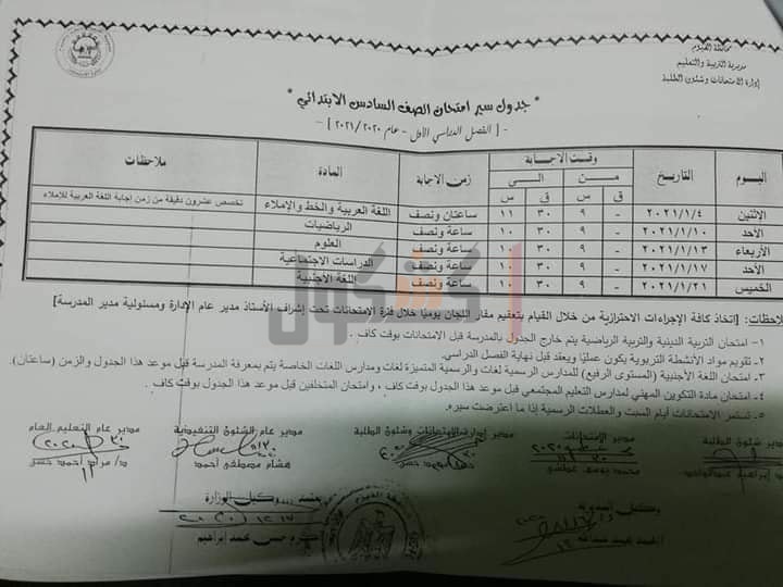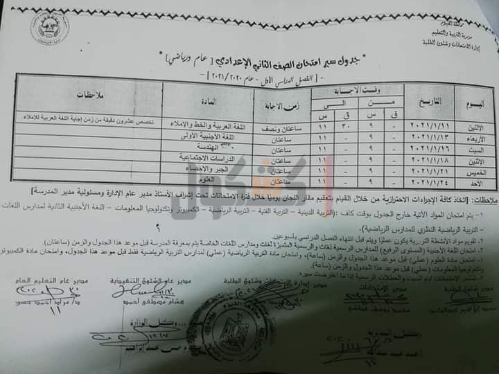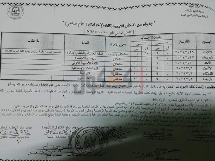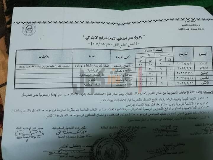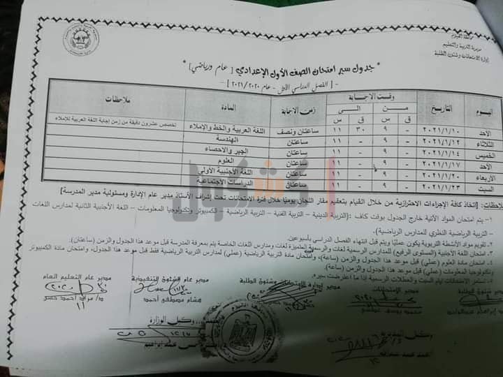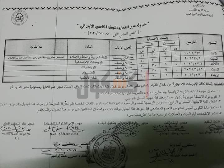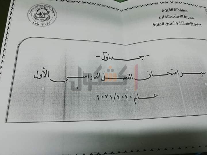 جدول امتحانات الفصل الدراسي الأول 2021/2020 بمحافظة الفيوم