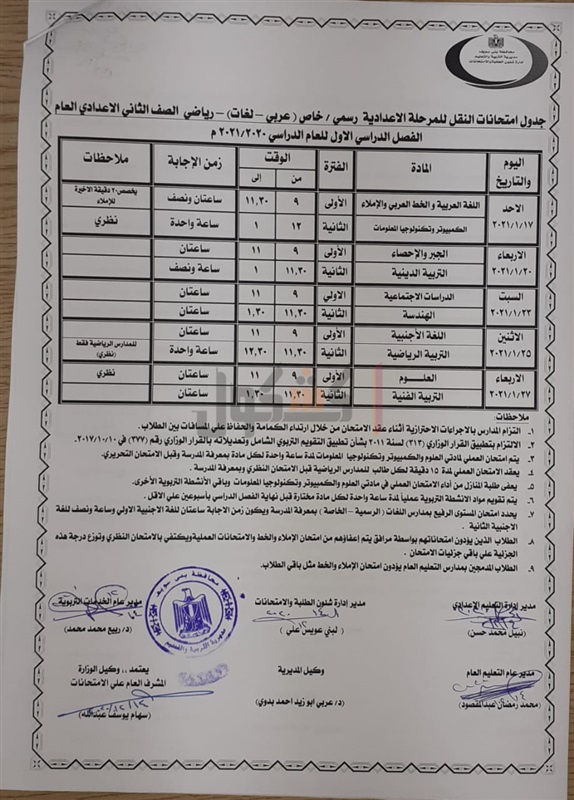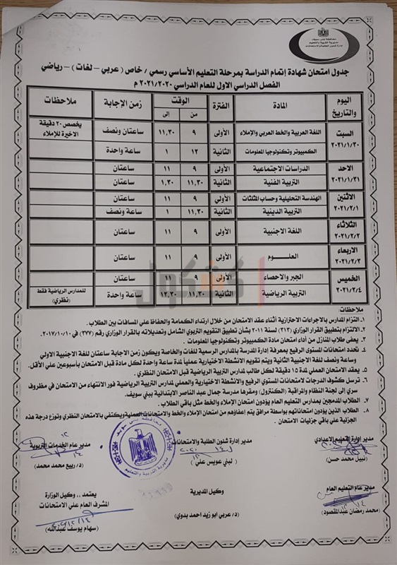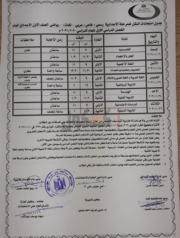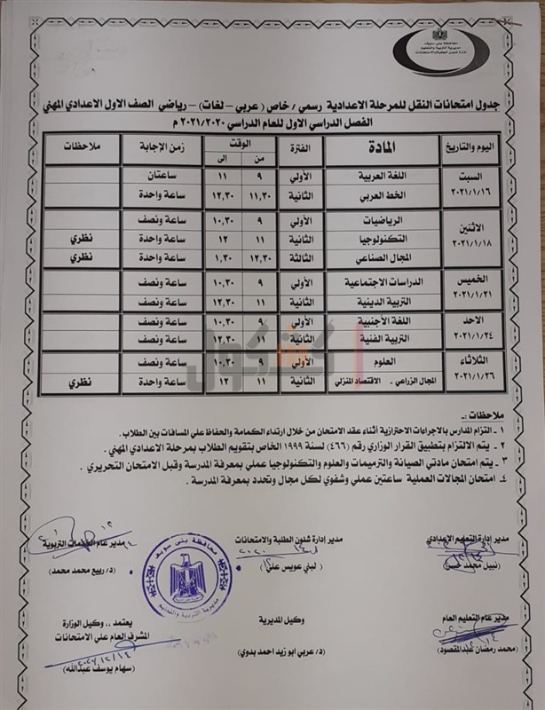 اعتمد الدكتور محمد هاني غنيم محافظ بنى سويف، جداول امتحانات الفصل الدراسى الأول 2020/2021 ، لصفوف النقل بالمرحلتين الإبتدائية والإعدادية والشهادة الإعدادية "عام ومهني"، حيث تبدأ الامتحانات يوم السبت 16 يناير 2021 وتنتهى الخميس 4 فبراير 2021.