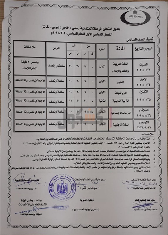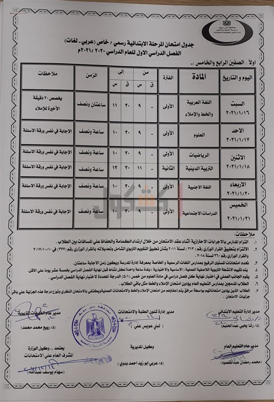 أوضحت سهام يوسف وكيل وزارة التربية والتعليم بمحافظة بنى سويف، أن امتحانات الصفين الرابع والخامس الابتدائى تبدأ يوم السبت 16 يناير المقبل وتنتهى الخميس 21 من نفس الشهر، فيما تبدأ امتحانات الصف السادس الابتدائى يوم السبت 23 يناير وتنتهى الأربعاء 27 يناير، بينما تبدأ امتحانات الصف الأول الإعدادى يوم السبت 16 يناير وتنتهى يوم الثلاثاء 26 يناير، فيما تبدأ امتحانات الصف الثانى الإعدادى يوم الأحد 17 يناير وتنتهى الأربعاء 27 يناير، فيما تبدأ امتحانات الصف الثالث الإعدادى يوم السبت 30 يناير وتنتهى الخميس 4 فبراير 2021.